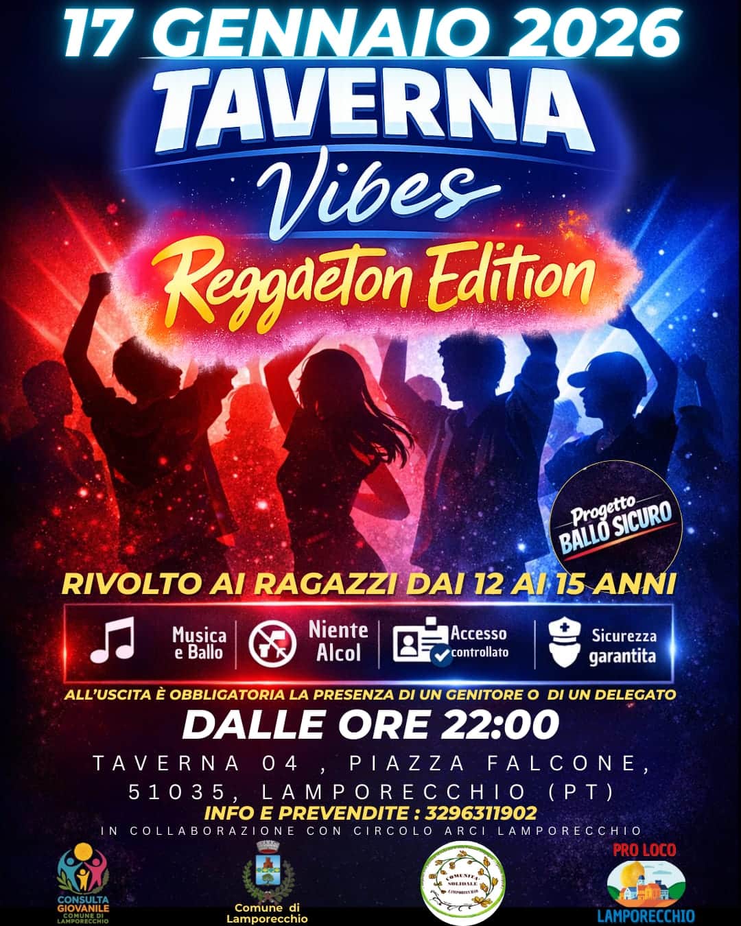 Il progetto prenderà ufficialmente il via a partire dalle ore 22:00 con “Taverna Vibes – Reggaeton Edition”, evento che avrà luogo presso la Taverna 04, in Piazza Falcone a Lamporecchio, esclusivamente riservato ai ragazzi di età compresa tra i 12 e i 15 anni.