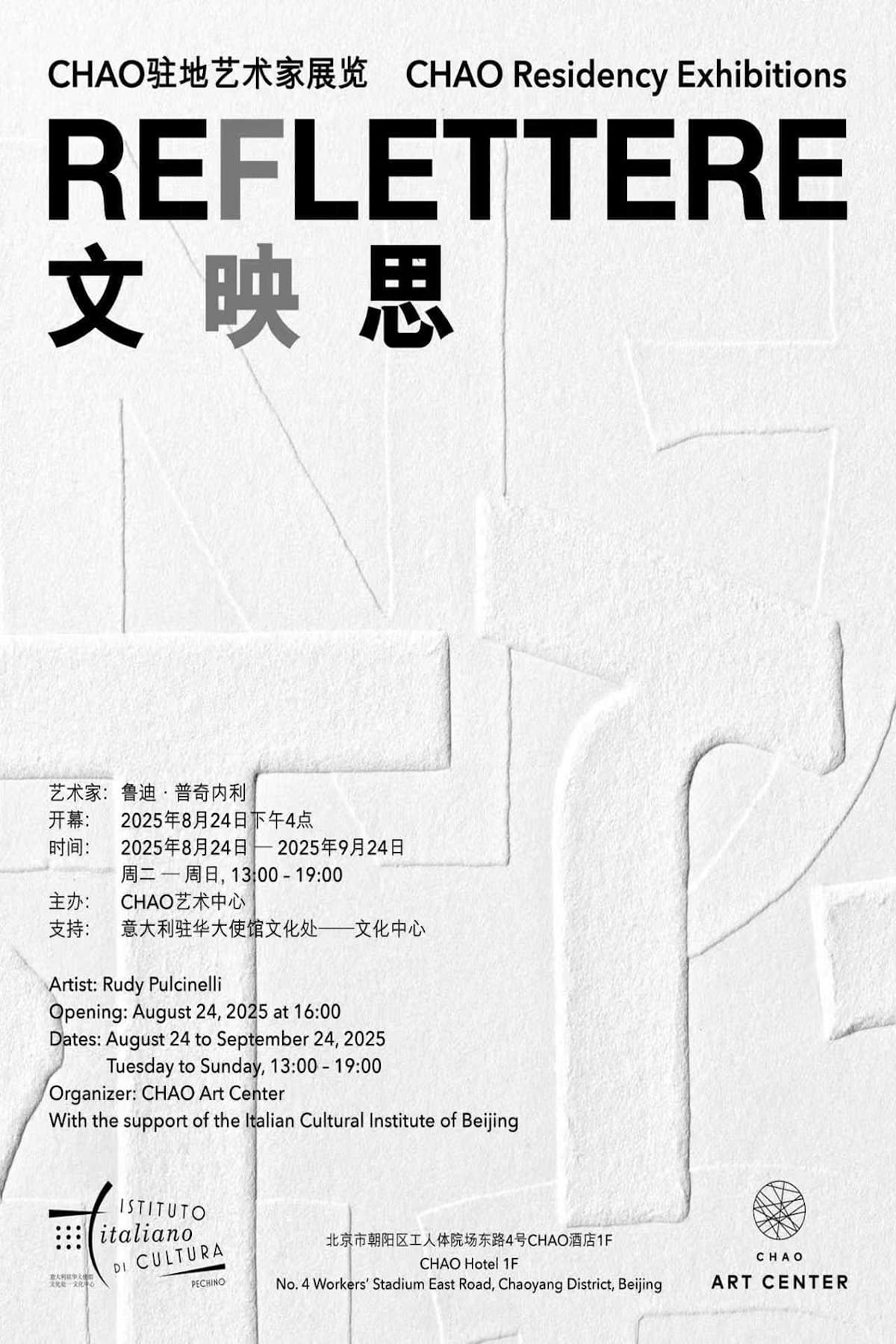 REFLETTERE non è solo il risultato di una residenza, ma un nuovo capitolo in una ricerca coerente e necessaria. Nel cuore di Pechino, Rudy Pulcinelli porta un messaggio profondamente universale: il dialogo come bene da custodire, come strumento per superare le distanze, come responsabilità etica verso il futuro.