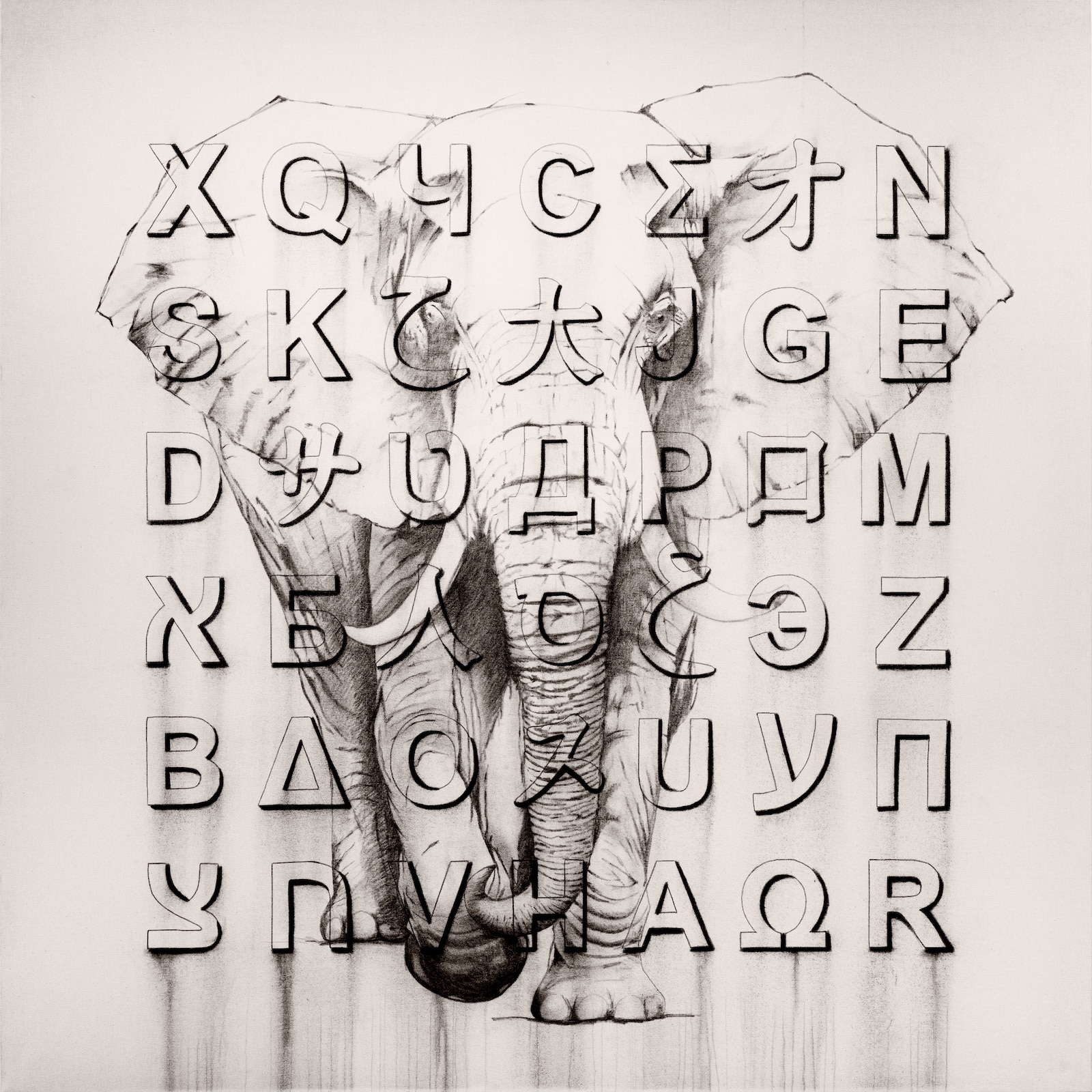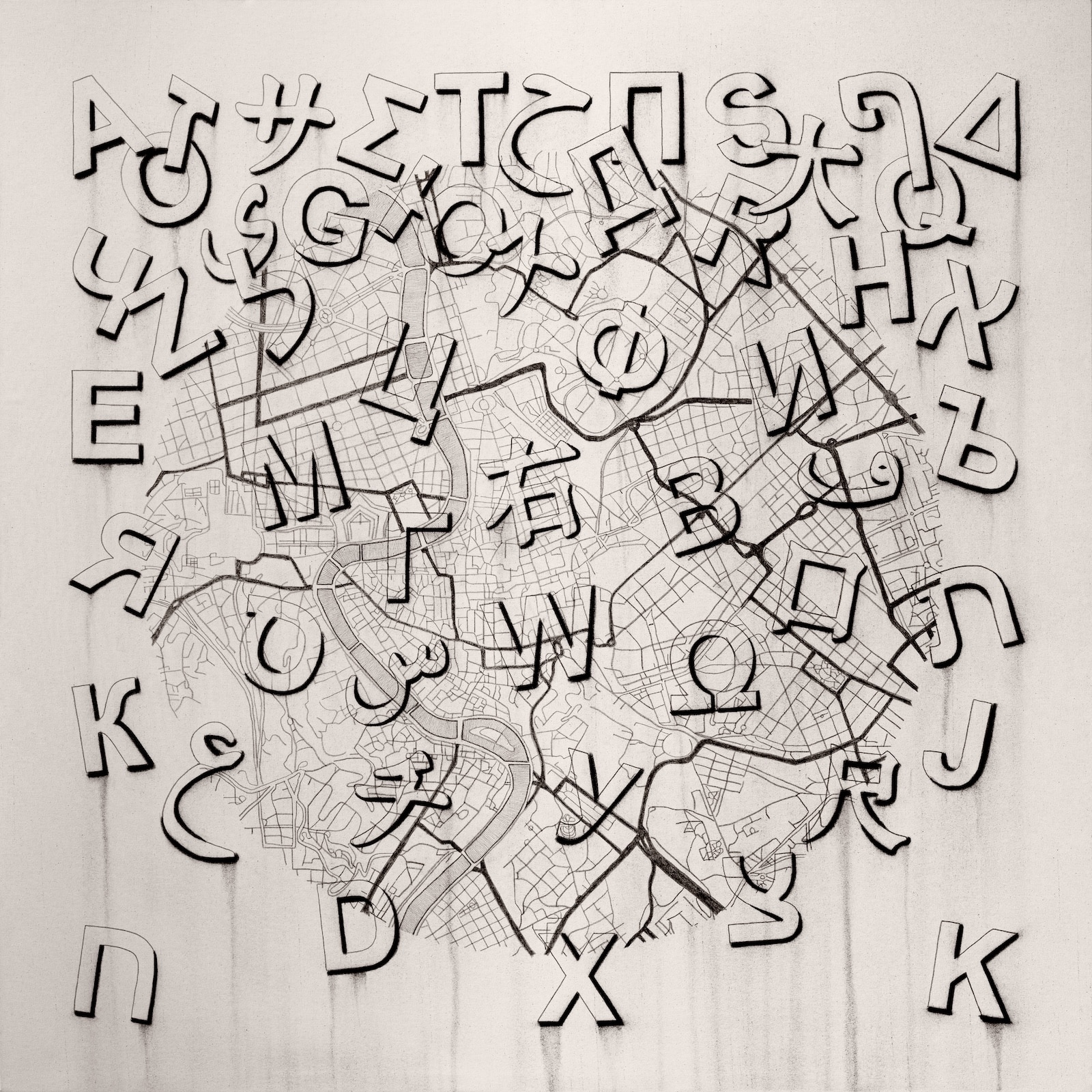 Da anni Pulcinelli ha individuato nelle lettere, tratte dai sette alfabeti più diffusi al mondo: latino, greco, cinese, arabo, cirillico, ebraico, giapponese, gli elementi essenziali del proprio linguaggio. Sagome, forme e simboli diventano gli ingredienti di un “grande alfabeto universale”, con cui l’artista intende parlare a tutti, senza distinzioni culturali o linguistiche.