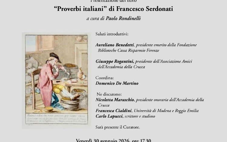 Il 30 gennaio 2026, alle ore 17:30 a Firenze, la Sala Convegni della Fondazione Biblioteche Cassa Risparmio Firenze ETS ospiterà un evento culturale di grande rilievo: la presentazione dell’opera monumentale Proverbi italiani di Francesco Serdonati, curata da Paolo Rondinelli e pubblicata dall’Accademia della Crusca nel 2024.