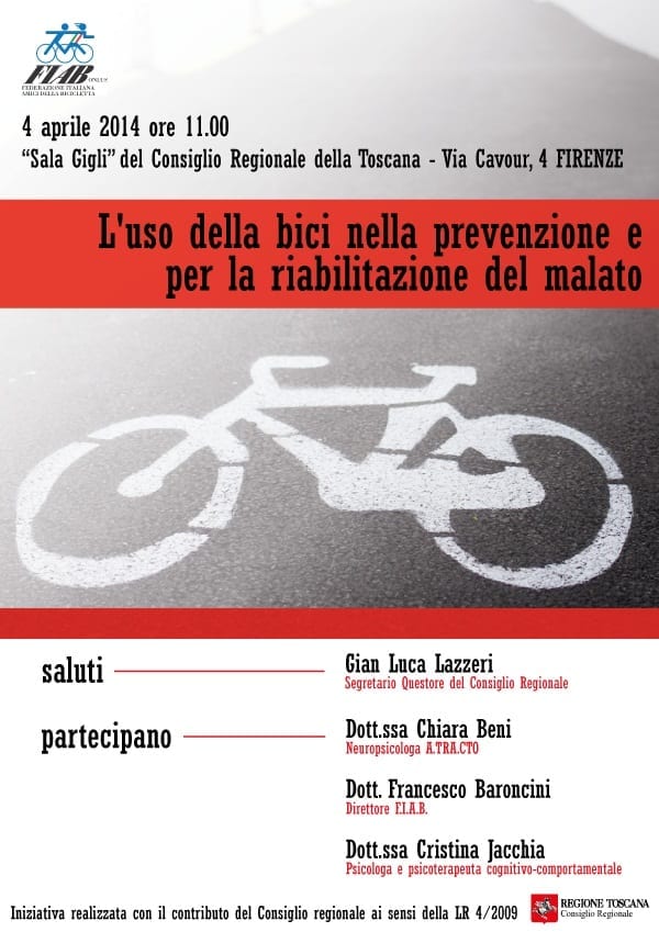 FIRENZE – «Prevenzione e riabilitazione del paziente a costi ridotti per il sistema sanitario nazionale: è questo il doppio contributo che la bicicletta può dare al benessere della società e dei singoli cittadini che devono affrontare un percorso di recupero motorio e allo stesso tempo prevenire le malattie croniche legate all’inattività fisica. Un ruolo importante spesso passato inosservato nelle politiche regionali alla salute che l’incontro di domani punta a diffondere a livello toscano». È la dichiarazione del consigliere regionale e Segretario Questore dell’ufficio di Presidenza, Gian Luca Lazzeri, che domani porterà il saluto del Consiglio Regionale all’iniziativa “L’uso della bici nella prevenzione e per la riabilitazione del malato”, organizzata dalla Fiab (Federazione Italiana Amici della Bicicletta) che si terrà domani 5 aprile alle 11.00 presso la Sala Gigli del Consiglio Regionale della Toscana (via Cavour, 2, Firenze). All’evento, oltre al Segretario Questore parteciperanno Chiara Ben, neuropsicologa di A.TRA.CTO, il direttore della Fiab, Francesco Baroncini e Cristina Jacchia psicologa e psicoterapeuta cognitivo-comportamentale.