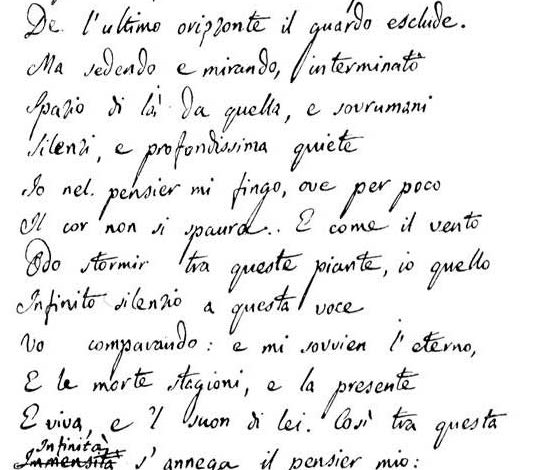 “L’infinito di Leopardi è così: il testo, nel senso più etimologico del termine, di una serie infinita di “distrazioni”, di insorgenti polluzioni di immagini e parole, come punti di accensione sentimentale e fantastica che mettono in questione il soggetto della scrittura e impediscono contemporaneamente al lettore di acquietarsi all’ombra di un significato definitivamente costituito immettendolo in una ricerca infinita, in un accumulo, prima ancora che di risposte, di domande.