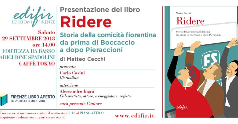 Questo sabato 29 settembre 2018 alle 14 alla Fortezza da Basso di Firenze, in occasione di Firenze libro aperto, Matteo Cecchi presenterà Ridere – Storia della comicità fiorentina da prima di Boccaccio a dopo Pieraccioni, l’ultimo libro del prolifico e fiorentinissimo scrittore edito da Edifir. Sarà ospite l’attore Alessandro Ingrà. Condurrà la presentazione il giornalista Carlo Casini, direttore di Isolottolegnaia.it