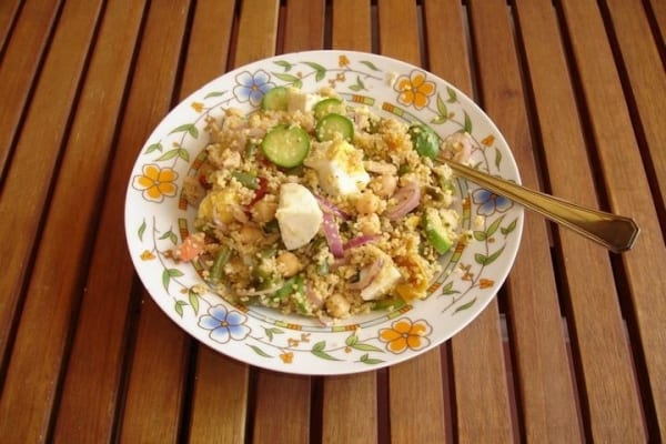 Preparare gr. 250 di cous cous, seguendo i tempi di cottura consigliati sulla confezione e metterlo in una zuppiera condito con olio e sale e a piacere del peperoncino. Lessare 2 uova, poi una manciata di fagiolini e due zucchine. Aggiungere il tutto al cous cous insieme a un cipollotto di Tropea affettato finemente e ai ceci scolati dal brodo di cottura. Condite con altro olio e prezzemolo. Aggiungete alle fine puntina di curry per un sapore più esotico!